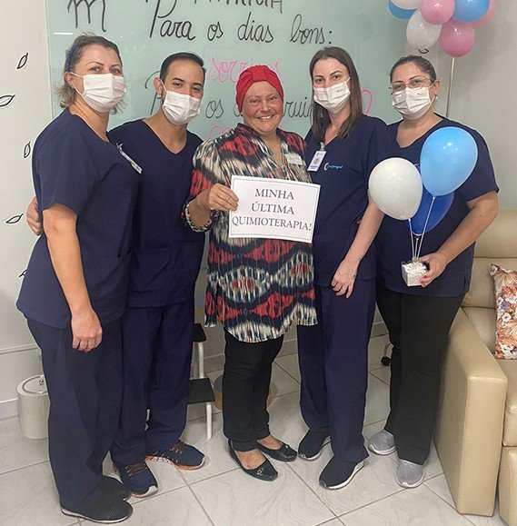 “Quando soube que teria que fazer quimioterapia, fiquei assustada, até posso dizer com medo dos efeitos da quimio, do mal estar que podia sentir. Mas, a atenção que todos me deram durante o meu tratamento, me tranquilizou e me fez passar por tudo isso com mais confiança.